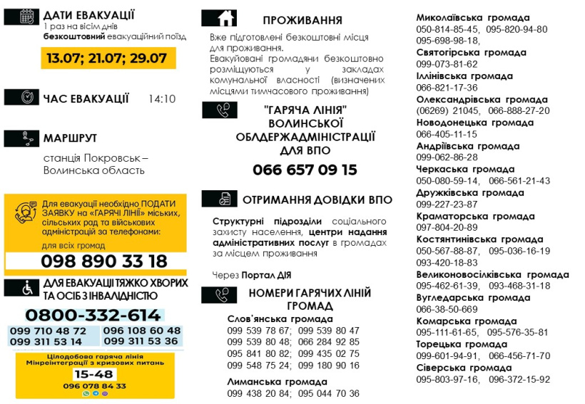 Евакуація до Волинської області здійснюватиметься спеціальним поїздом, 1 раз на 8 днів (наступні поїзди будуть 21.07; 29.07).