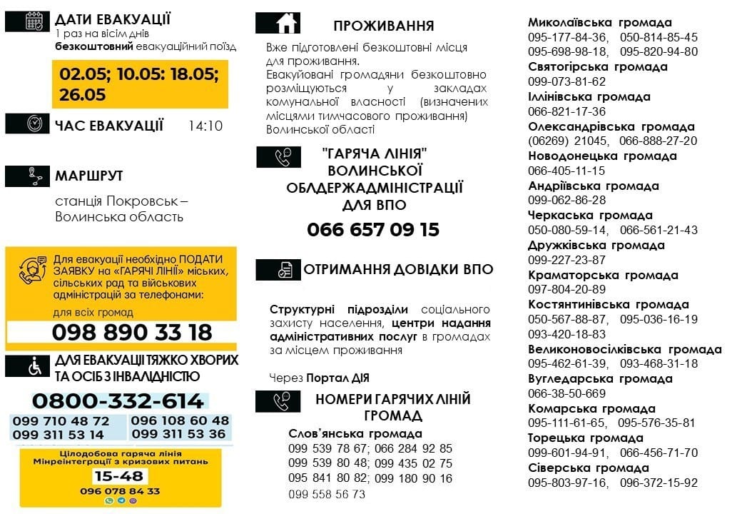 – дістатися до місця збору у вашому населеному пункті, звідки буде безкоштовний підвіз до евакуаційного поїзду у Покровську