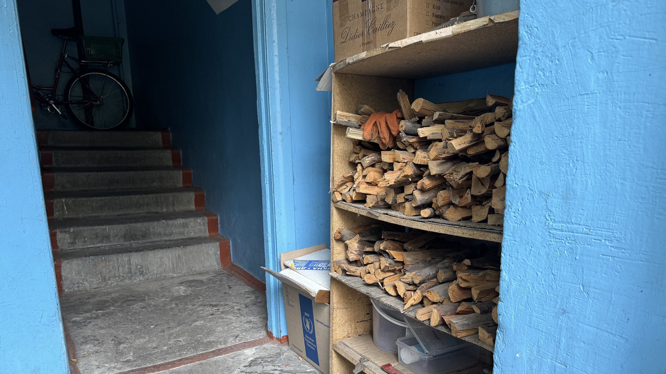Ольга розповідає, так обігріваються в багатоповерхівках. В під’їздах запаси дров ще з 2022 року, щоб готувати на вулиці, коли немає електроенергії.