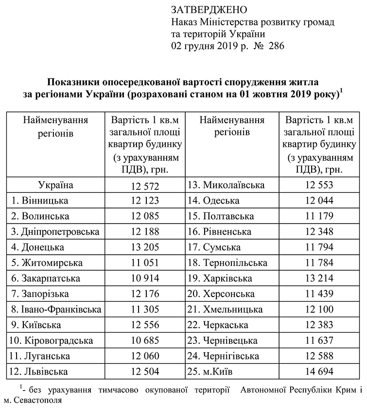 В Украине увеличена опосредованная стоимость 1 кв. м жилья в зависимости от региона страны. Новые показатели утверждены приказом Министерства развития громад и территорий № 286 от 02.12.2019, который опубликован на сайте ведомства, передают «Донецкие новости».