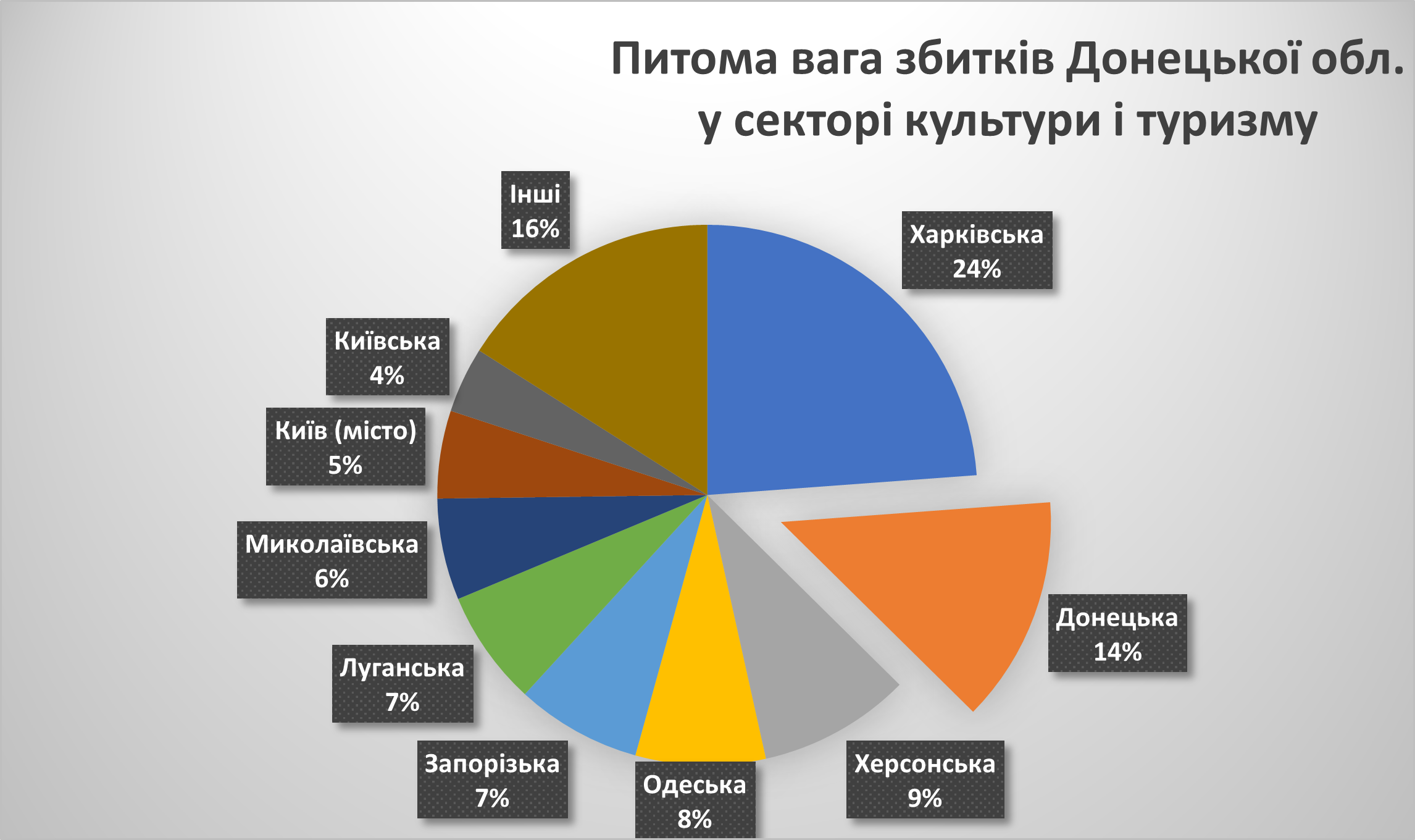 Станом на 31 грудня 2024 року загальна вартість збитків у секторі культури і туризму України оцінюється в 4,11 млрд доларів США. Донецька область, яка зазнала значних руйнувань, складає понад 14% від усіх збитків у цій сфері.
