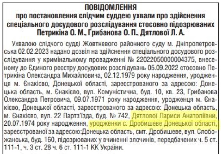 Згідно з офіційним повідомленням про виклик на допит, підозрювану звати Лариса Дятлова. Відповідно до відкритих реєстрів, у минулому жінка з таким ПІБ керувала міською організацією комуністів у Лимані. Крім того, Лариса Дятлова — колишня депутатка Лиманської міської ради.