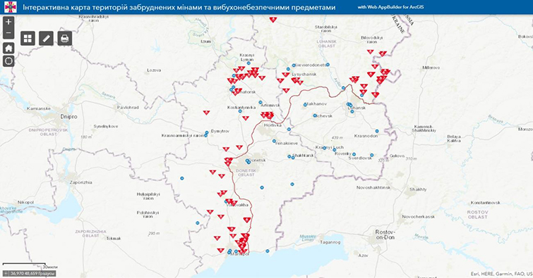 Интерактивная карта территорий, загрязненных минами и взрывоопасными предметами на официальном веб-сайте Министерства обороны Украины в разделе «Противоминная деятельность».