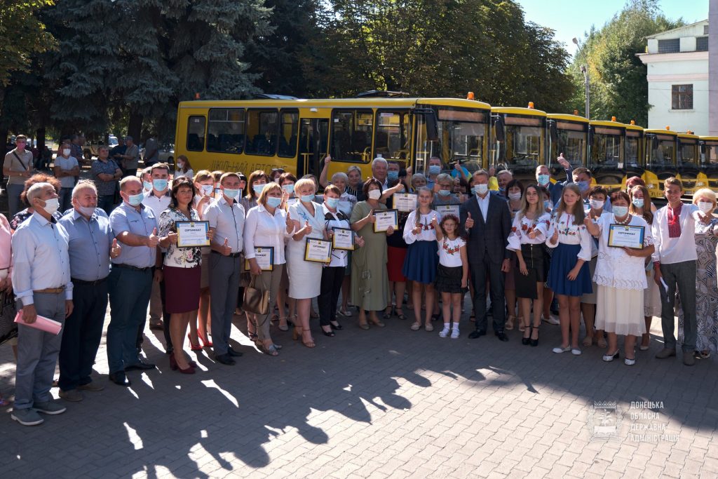 19 шкільних автобусів передали директорам опорних шкіл Іллінівської, Лиманської, Бахмутської, Сіверської, Соледарської ОТГ, Волноваського, Великоновоселківського, Слов’янського, Бахмутського, Мар’їнського, Мангушського, Нікольського, Покровського районів.