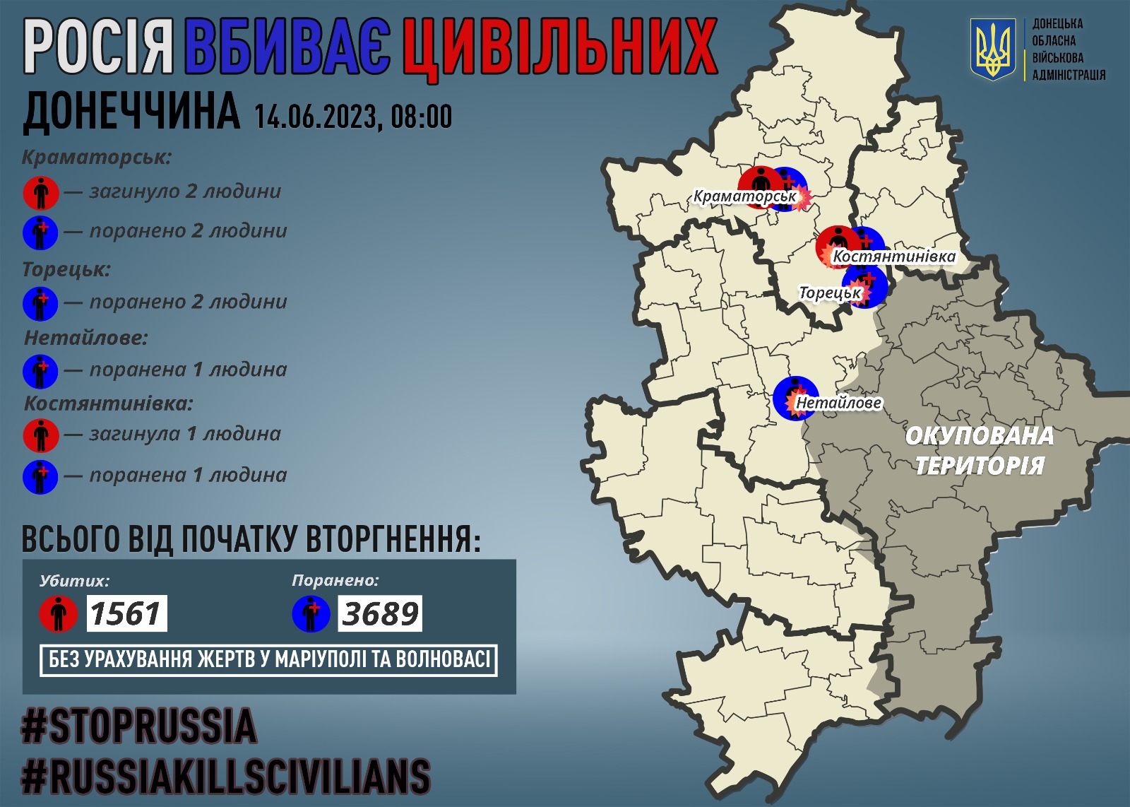 За 13 червня росіяни вбили 3 жителів Донеччини: 2 у Краматорську та 1 у Костянтинівці. Як інформують Слов’янські відомості, про це повідомив начальник Донецької обласної військової адміністрації Павло Кириленко.