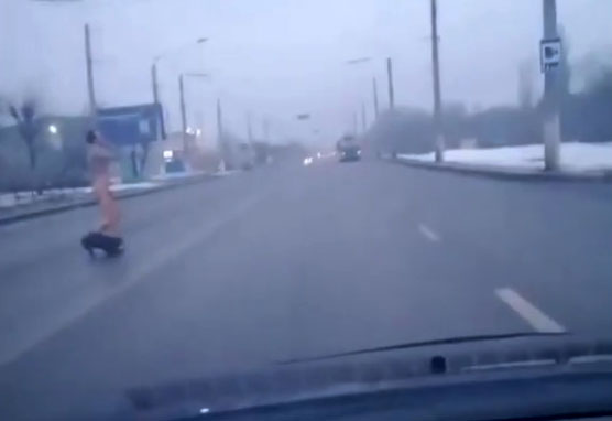 Утром 20 декабря в Сети появилось снятое в Краматорске видео странного содержания: совершенно голый гражданин вприпрыжку пересекает магистральную улицу О. Тихого в районе микрорайоне “Станкострой”.