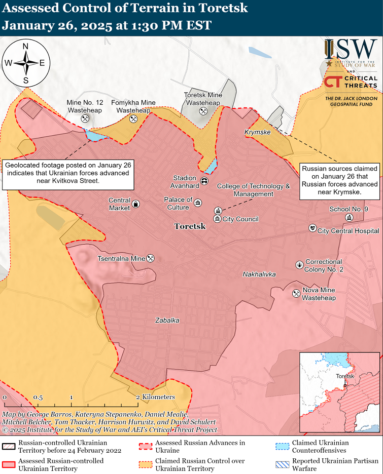 «російські війська також можуть спробувати використати тактичні переваги в межах і поблизу Торецька та на схід від Покровська, щоб знищити українські позиції на південний захід від Торецька, і деякі російські блогери нещодавно припустили, що російські війська можуть активізувати наступальні операції на південний захід від Торецька з цією метою», — зауважують аналітики.