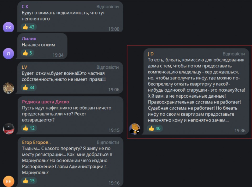 «Тобто комісію для обстеження будинку, щоб потім надати компенсацію власнику — не дочекаєшся, але щоб отримати інфу, де можна по беззаконню віджати квартирку у якоїсь самотньої бабусі – будь ласка?! Х*й вам, а не персональні дані! Правоохоронна система не працює! Судова система не працює! Але інфу за своїми квартирами надайте комусь і незрозуміло навіщо», — обурюється маріуполець «J.D.» у соціальних мережах.