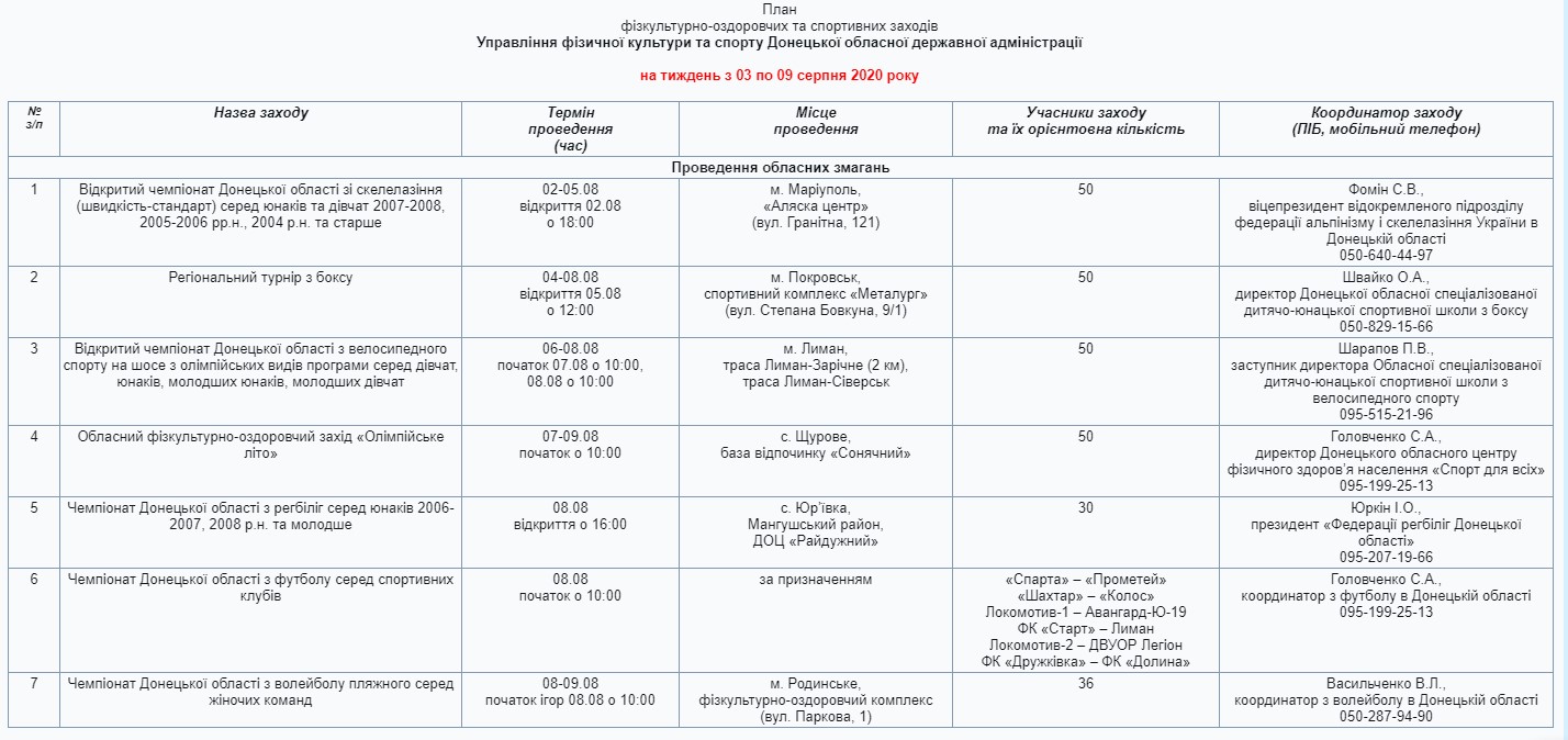 План опубліковано на сайті Управління фізичної культури та спорту Донецької обласної державної адміністрації.