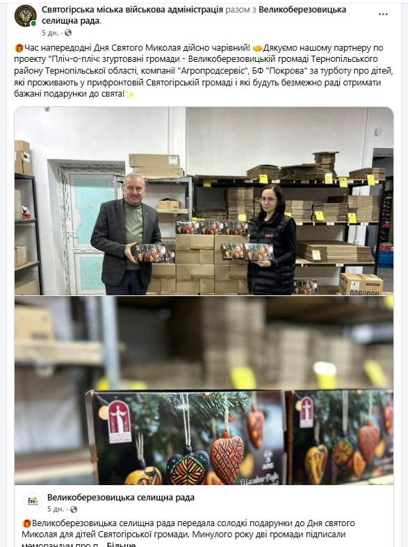 Наприклад, на офіційній сторінці Святогірської МВА у Фейсбуці за листопад немає жодного оголошення про видачу гуманітарної чи будь-якої іншої допомоги. Згадали лише прийом фахівців ПФУ та пропонують взяти участь в опитуванні. Решта — загальні повідомлення з інших офіційних ресурсів уряду та Донецької області. Лише 5 грудня з’явилася згадка про допомогу, яку отримала громада для дітей від Великоберезовицької громади Тернопільської області. Але тут, знову ж таки, немає жодної згадки про те, як і кому будуть видавати новорічні подарунки. За даними МВА, у Святогірську лише одна дитина, ще 6 дітей перебувають в Святогірській Свято-Успенській Лаврі. Загалом у громаді проживають 126 неповнолітніх.