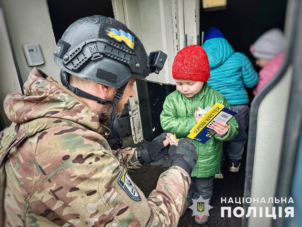 Із зони бойових дій малечу вивезли безпечно та з комфортом. Поліцейські потурбувалися, щоб процес вимушеного переїзду залишився в пам’яті дітей як приємна мандрівка, та подарували молодшим коробку з іграшками та іншою дитячою «радістю». Дорогою дівчатка та наймолодший чоловік в родині малювали та просили правоохоронців надути кульки.