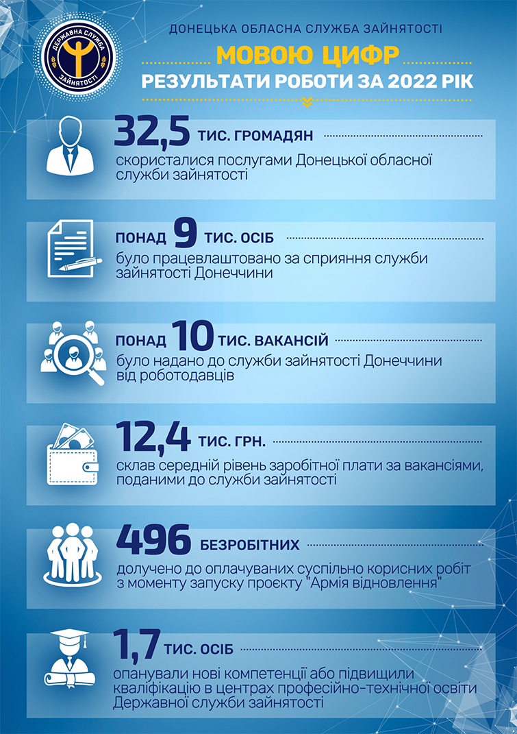 2022 рік для Донецької обласної служби зайнятості був роком активного розвитку комунікацій між учасниками ринку праці з використанням власних онлайн-ресурсів, нестандартних підходів та дистанційних форм роботи.