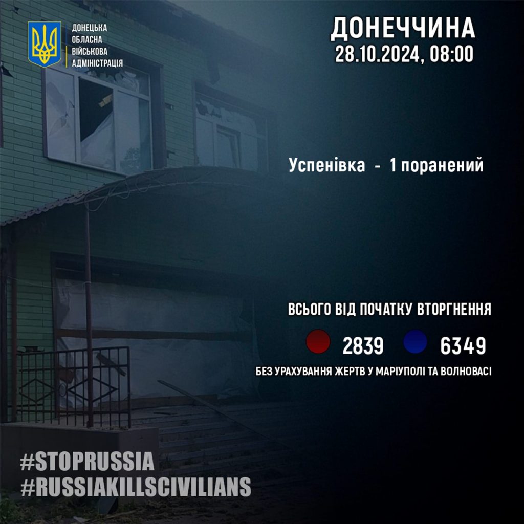 За 27 жовтня росіяни поранили 1 жителя Донеччини — в Успенівці.
