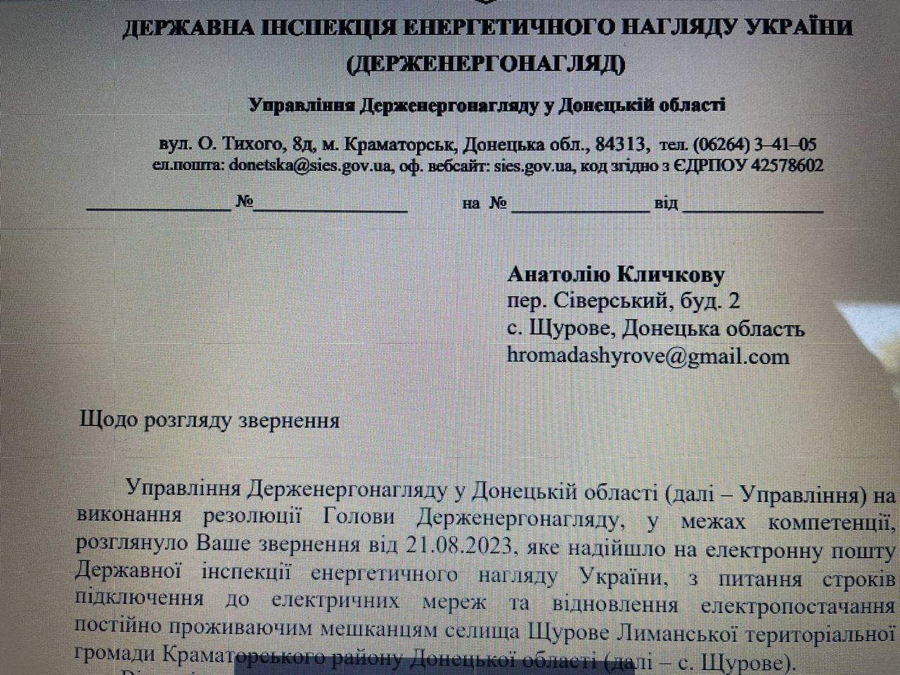 «Станом на час розгляду Вашого звернення (28 серпня 2023 – ред.) електропостачання споживачів у с. Щурове Донецької області не відновлено».