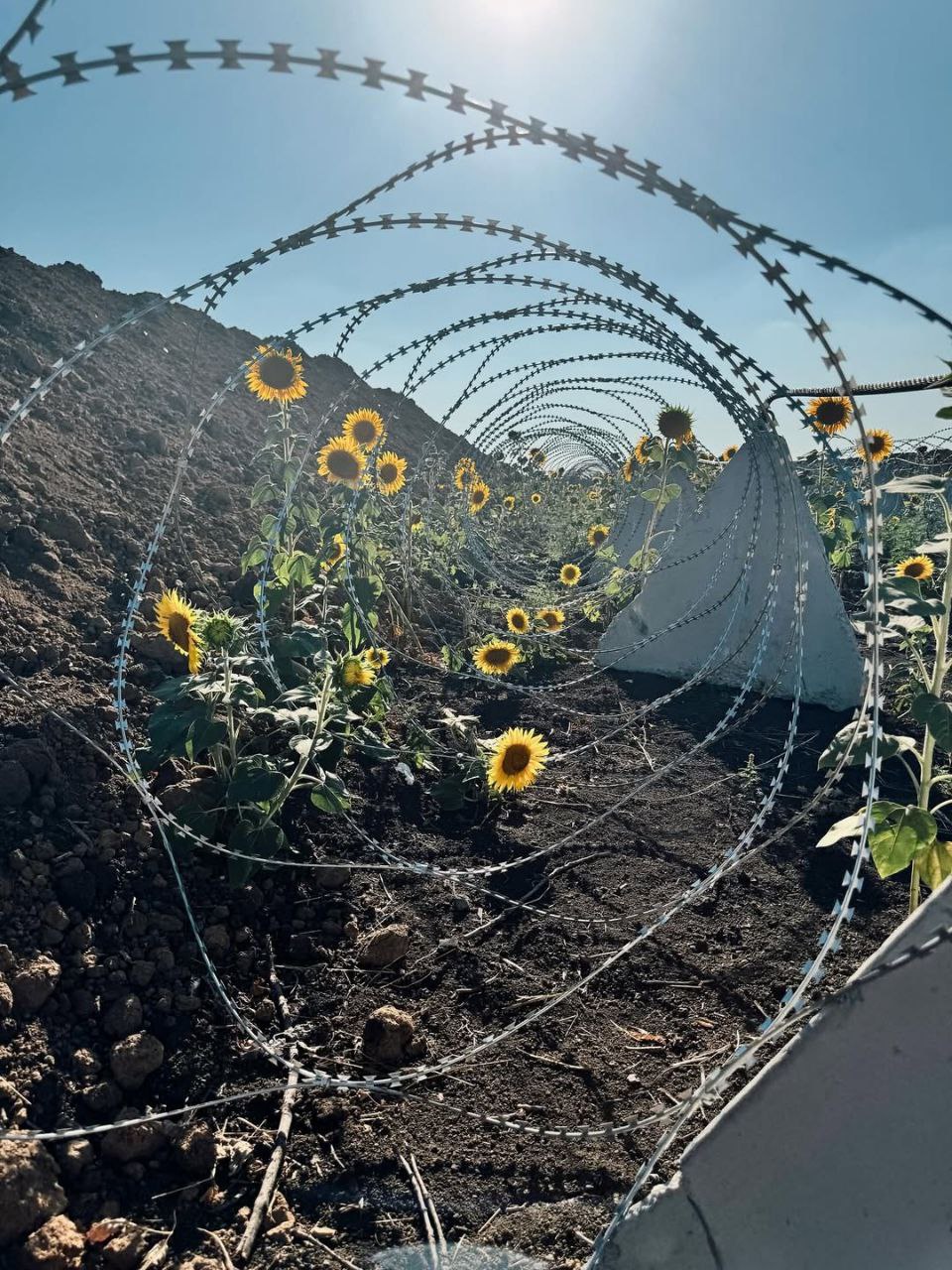 На фото — соняхи, що проросли крізь колючий дріт оборонних рубежів на Донеччині.