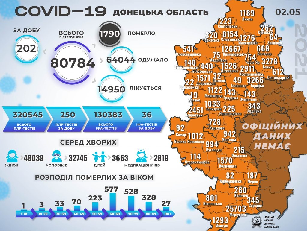 “За неділю, 2 травня, лабораторії Донеччини повідомили про ще 202 хворих на коронавірусну хворобу: