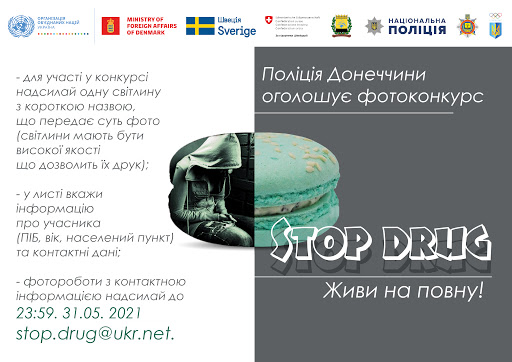 Поліція Донеччини за ініціативною Краматорського районного управління поліції в Донецькій області та за підтримки Програми ООН із відновлення та розбудови миру оголошує фотоконкурс на найкраще соціальне фото про шкоду наркотиків.