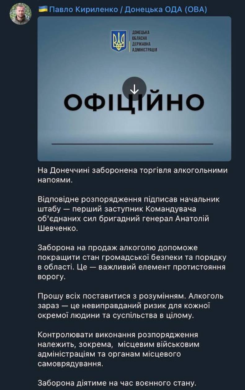 Кириленко також зазначив, що бачить наслідки вживання алкоголю та підкреслив, що заборона діятиме до перемоги.