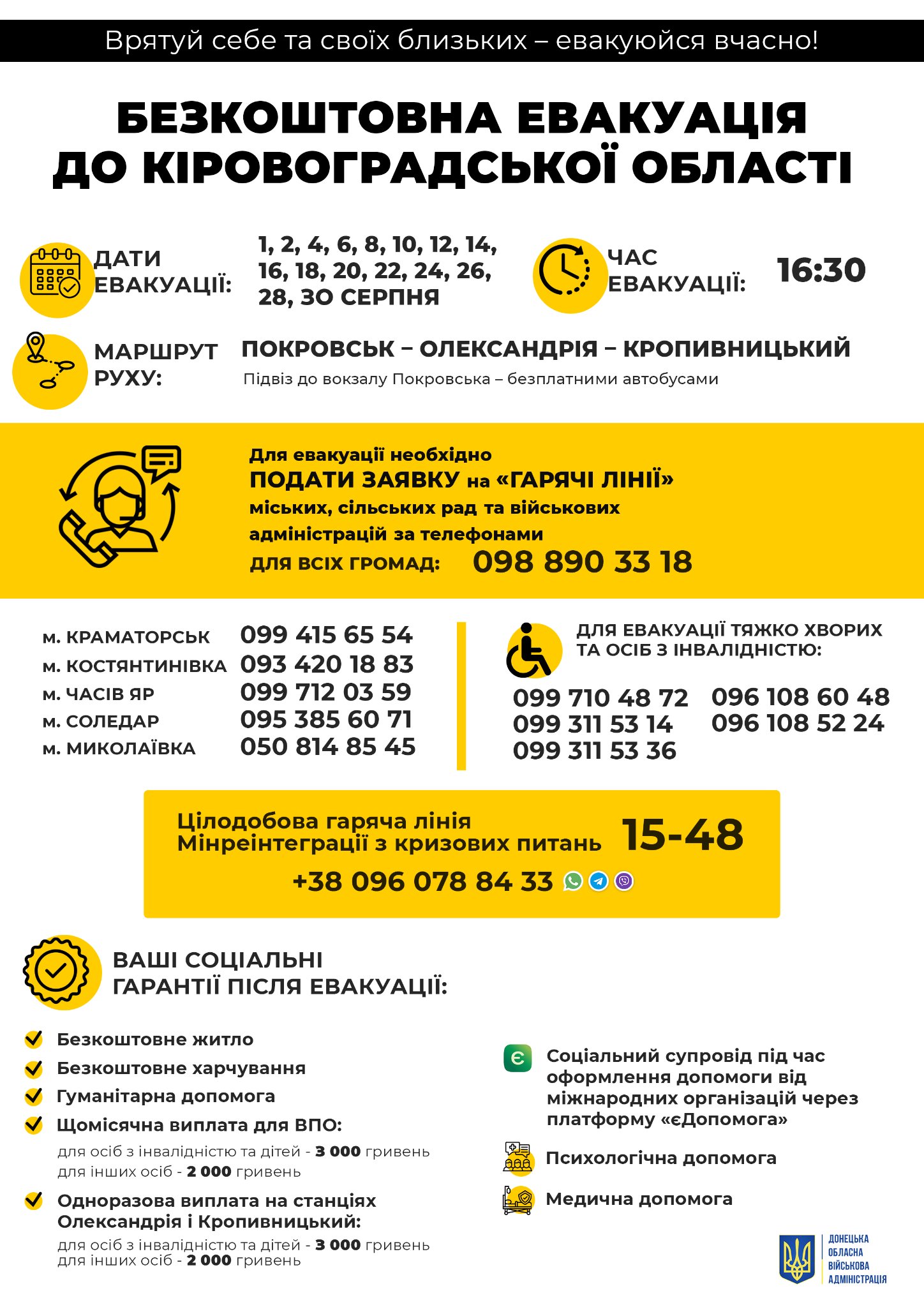 — дістатися до місця збору, звідки буде безкоштовний підвіз до евакуаційного потягу у Покровську;