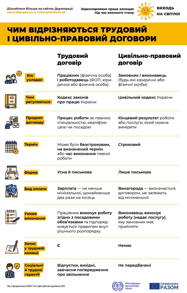 З більш детальною інформацією щодо роботи за трудовим договором або виконанням робіт за договорами цивільно-правового характеру можна ознайомитися на сайті Держпраці за посиланням https://dsp.gov.ua/podolannia-nelehalnoi-zainiatosti/trudovyi-chy-tsyvilno-pravovyi-dohovir/.