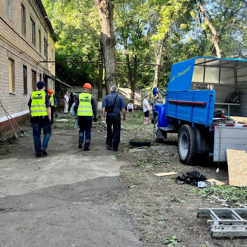 Співробітники комунальних служб, керуючої компанії «ЛАДІС», міськгазу працюють над усуненням наслідків рашистського ракетного удару по Краматорську цієї ночі.