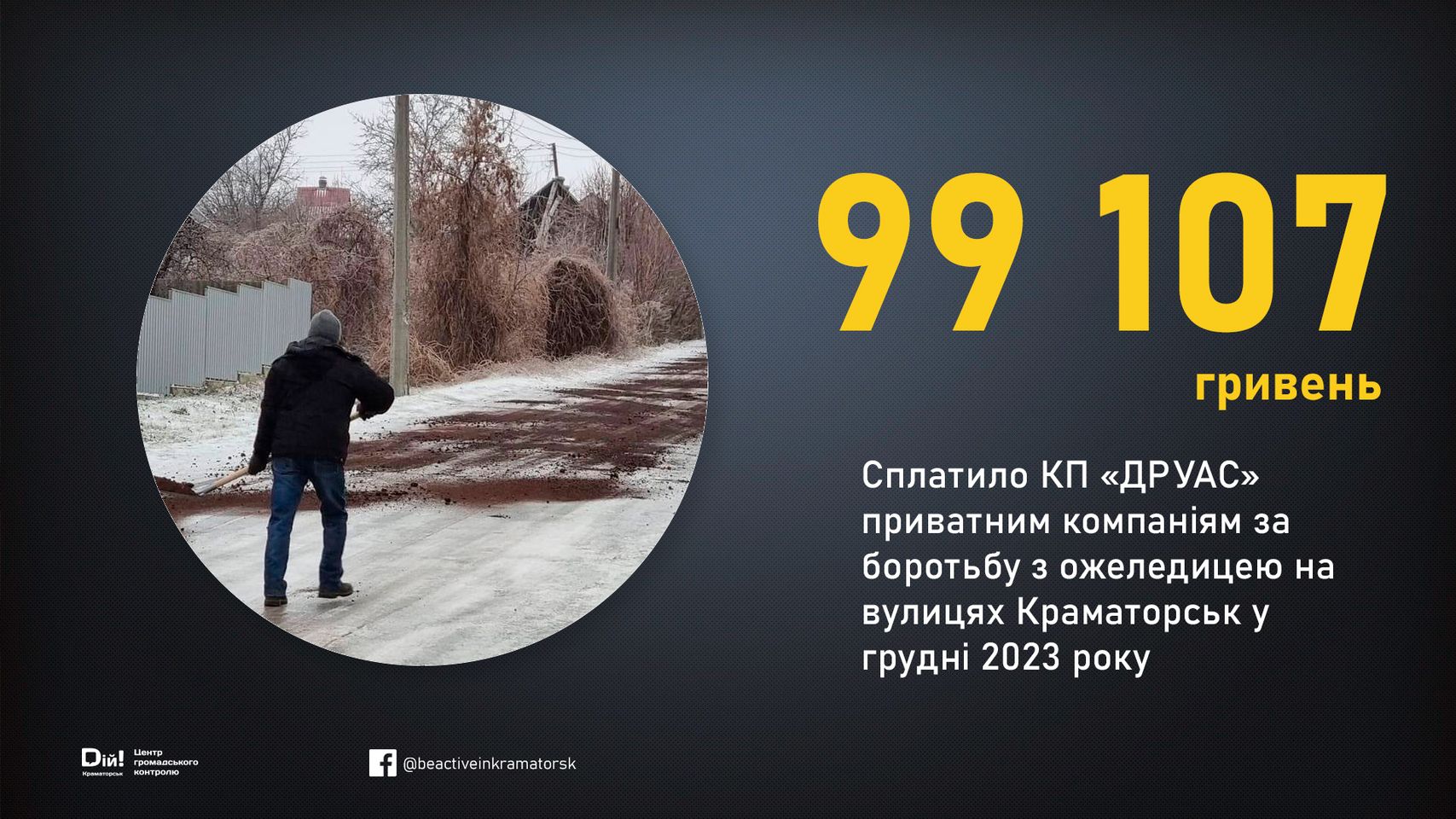 КП «ДРУАС» витратило майже 100 тисяч гривень на оплату приватним структурам послуг з прибирання міста від льоду – пише “Дій-Краматорськ”.