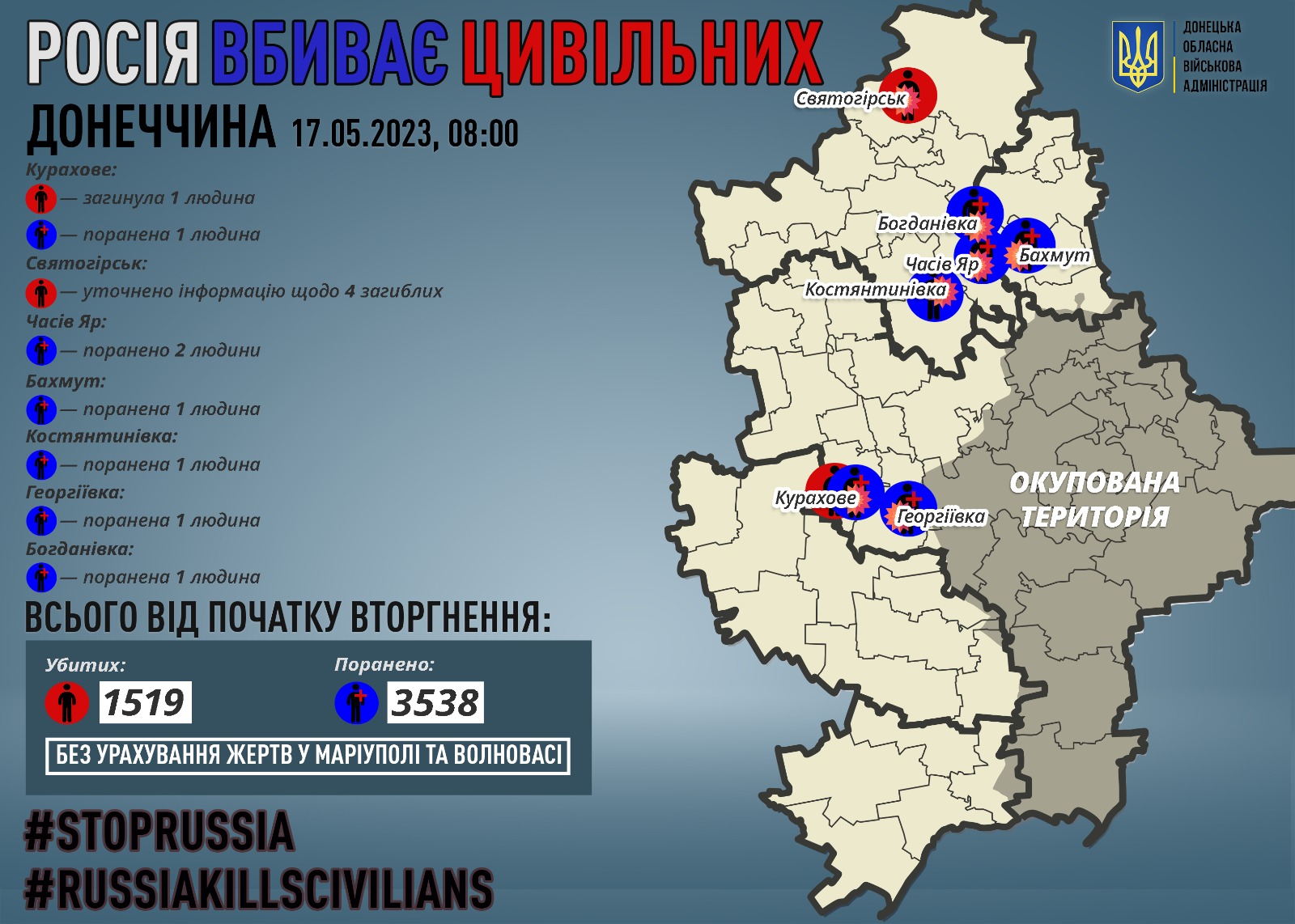 За 16 травня росіяни вбили 1 жителя Донеччини — у Куг. Про це повідомив начальник Донецької обласної військової адміністрації Павло Кириленко