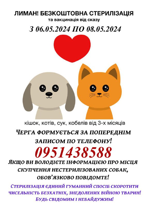 До Святогірської та Лиманської громади завітають ветеринари німецької організації «Tiernothilfe Ukraine e.V» з гуманітарною місією. Вони будуть стерилізувати та вакцинувати від сказу безпритульних тварин та хатніх собак і кішок за бажанням власників. Про це повідомляють “Слов’янські Відомості”.