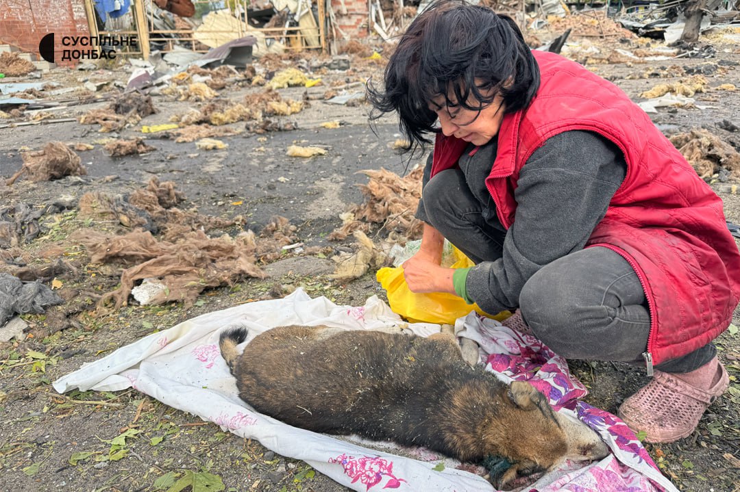 Відразу після російської атаки на подвір’ї потрощеного будинку місцева жителька і зооволонтерка Ірина шукає своїх собак. Одного — знаходить на подвір’ї.