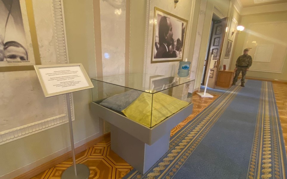 У Верховній Раді України відкрили стенд з Державним прапором зі Святогірська. Він пережив активні бойові дії та тимчасову окупацію.