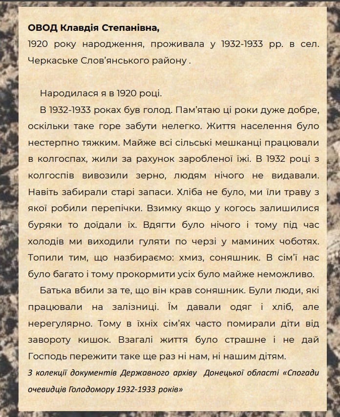 “Я пам’ятаю попухлих людей, їхні голодні очі… Щоб вижити, люди варили їжу з усього, що було під ногами: трава, кора дерев, жолуді. Ловили їжаків, ящірок, птахів, різали собак”, — згадує очевидиця тих подій на Донеччині.
