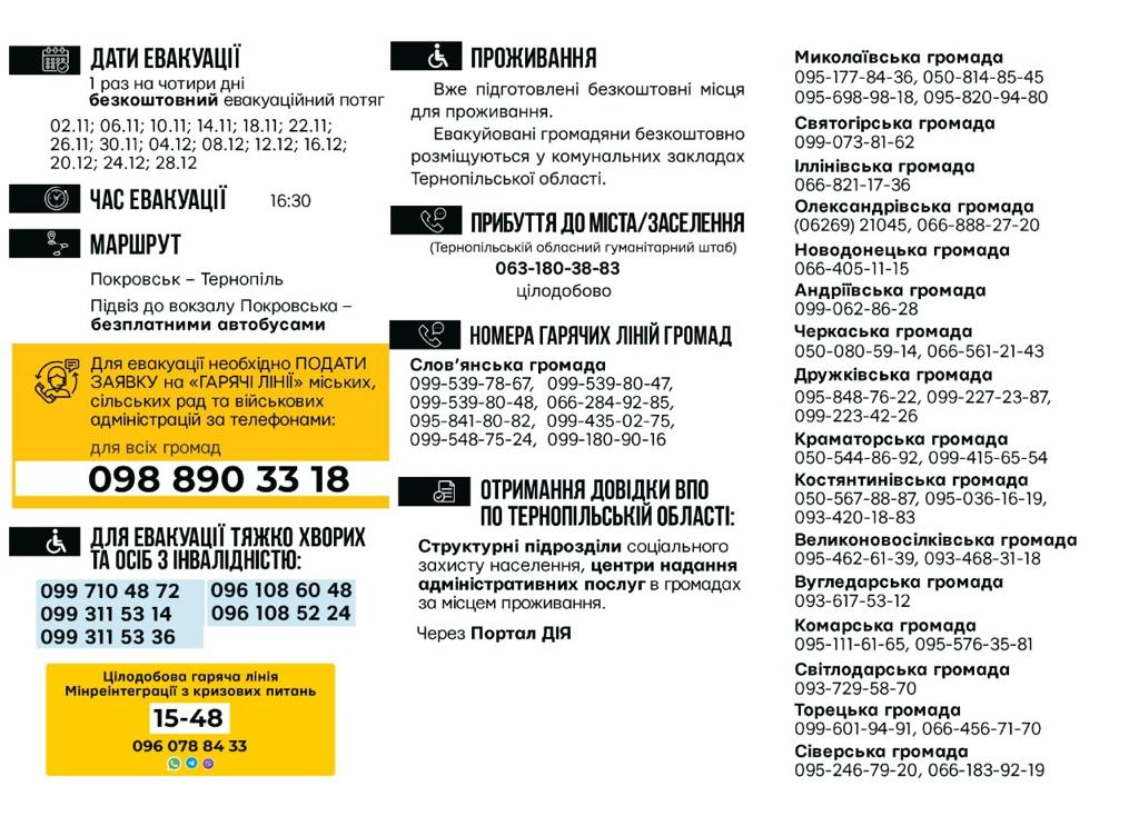Евакуація до Тернопільської області здійснюватиметься спеціальним поїздом, 1 раз на 4 дні по парним дням, по таких датах – 02.11; 06.11; 10.11; 14.11; 18.11; 22.11; 26.11; 30.11.