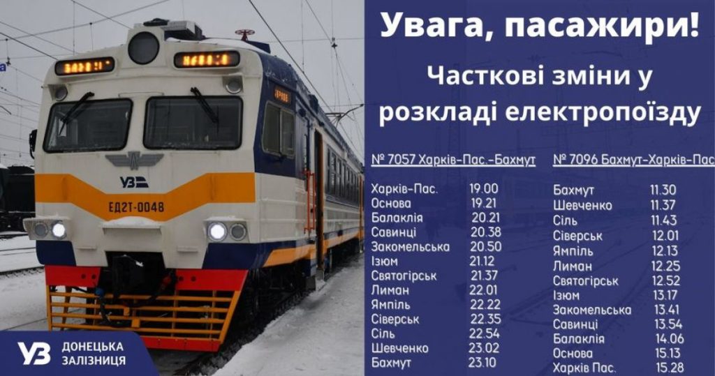 Так, с 16 января модернизированный электропоезд № 7096/7057 Бахмут – Харьков – Бахмут начал курсировать по новому графику. Об этом сообщается в связи с производственной необходимостью и для улучшения обслуживания на железной дороге.
