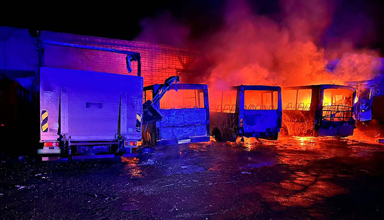 У Краматорську рятувальники 12 державного пожежно-рятувального загону ліквідували загоряння 2 вантажних автомобілів та 3 автобусів. Вогнеборцям вдалось оперативно загасити пожежу та врятувати від вогню один автомобіль.