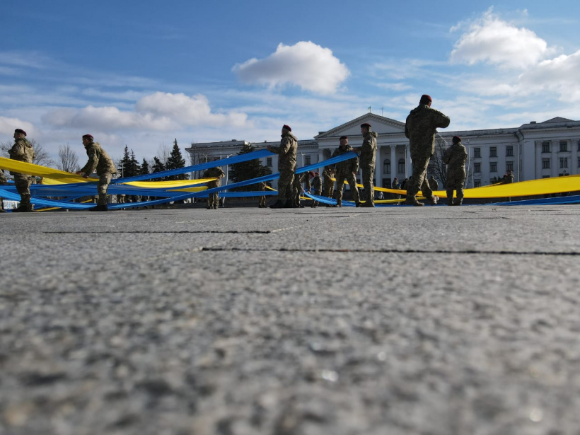 Шесть полотен патриотических цветов передала украинским защитникам для проведения акции Донецкая областная государственная администрация.