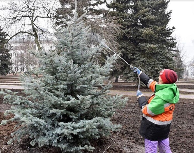В связи с участившимися случаями похищения новых зеленых насаждений, специалисты коммунального предприятия ДРУАС обрабатывают елки и другие растения специальным раствором.