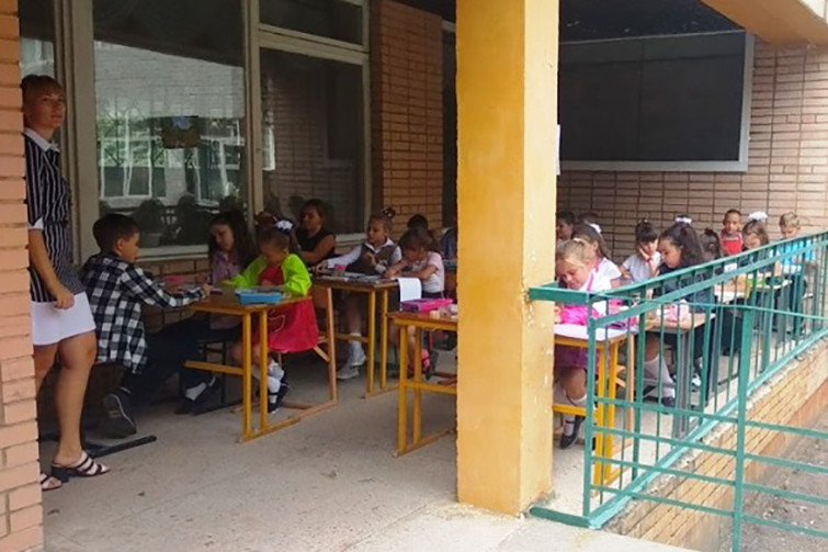 В ОШ №9 Краматорска уроки проводят на улице. Правда не всегда, а только если светит солнышко и на улице очень тепло, сообщает Восточный Проект.
