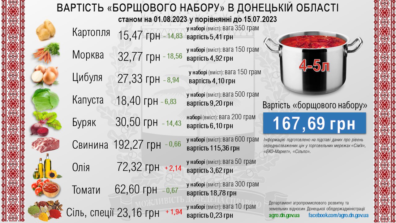 Вартість «борщового набору» в Донецькій області станом на 01.08.2023 у порівнянні до 15.07.2023.