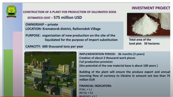 В презентации инвестпроекта указано, что строительство завода мощностью 600 тыс. тонн в год рассчитано на три года, на нем планируется создать около 2 тыс. рабочих мест. Локация – поселок Райгородок под Краматорском, площадь земельного участка – 50 га, запасы сырья – на 100 лет работы. Предполагается, что реализация проекта позволит поставлять кальцинированную соду на экспорт и обеспечит валютные поступления в Украину в размере не менее 75 млн евро.
