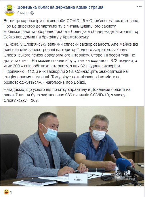 «Дійсно, у Слов’янську великий сплески захворюваності. Але майже всі нові випадки зареєстровані на території одного закритого закладу – Слов’янського психоневрологічного інтернату. Сторонні особи туди не допускаються. На момент появи вірусу там знаходилося 672 людини, з яких 260 – співробітники інтернату, з них 62 людини захворіли. Підопічних – 412, з них захворіли 216. Одинадцять знаходяться на стаціонарному лікуванні. Тому вірус локалізовано і по місту не розповсюджується», – наголосив Ігор Бойко.