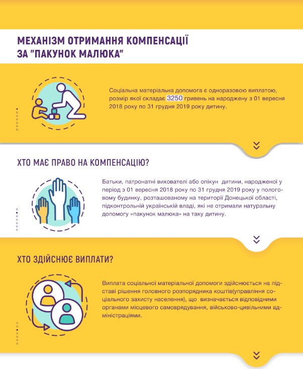 Жінки, які народили дітей з 1 вересня 2018 року по 31 грудня 2019 року у пологовому будинку на території Донецької області, підконтрольній українській владі, отримають грошову компенсацію за неотримані «бебібокси». Наразі на це виділені кошти з обласного бюджету, а також затверджений механізм таких виплат.
