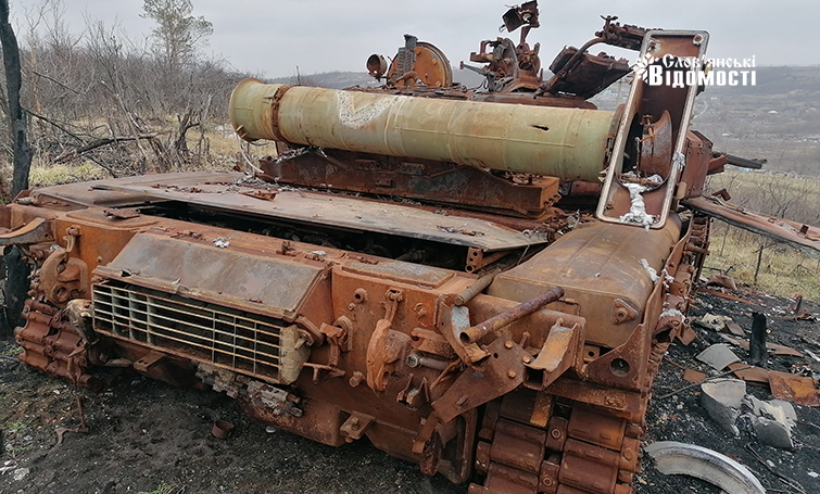 На трасі до Святогірська залишки від реактивних систем залпового вогню – дорога буквально засіяна уламками від боєприпасів. Всюди, як на дорозі, так і в самому селі, стоїть згоріла російська техніка. Крім руїн, окупанти залишили після себе ще й гори сміття…