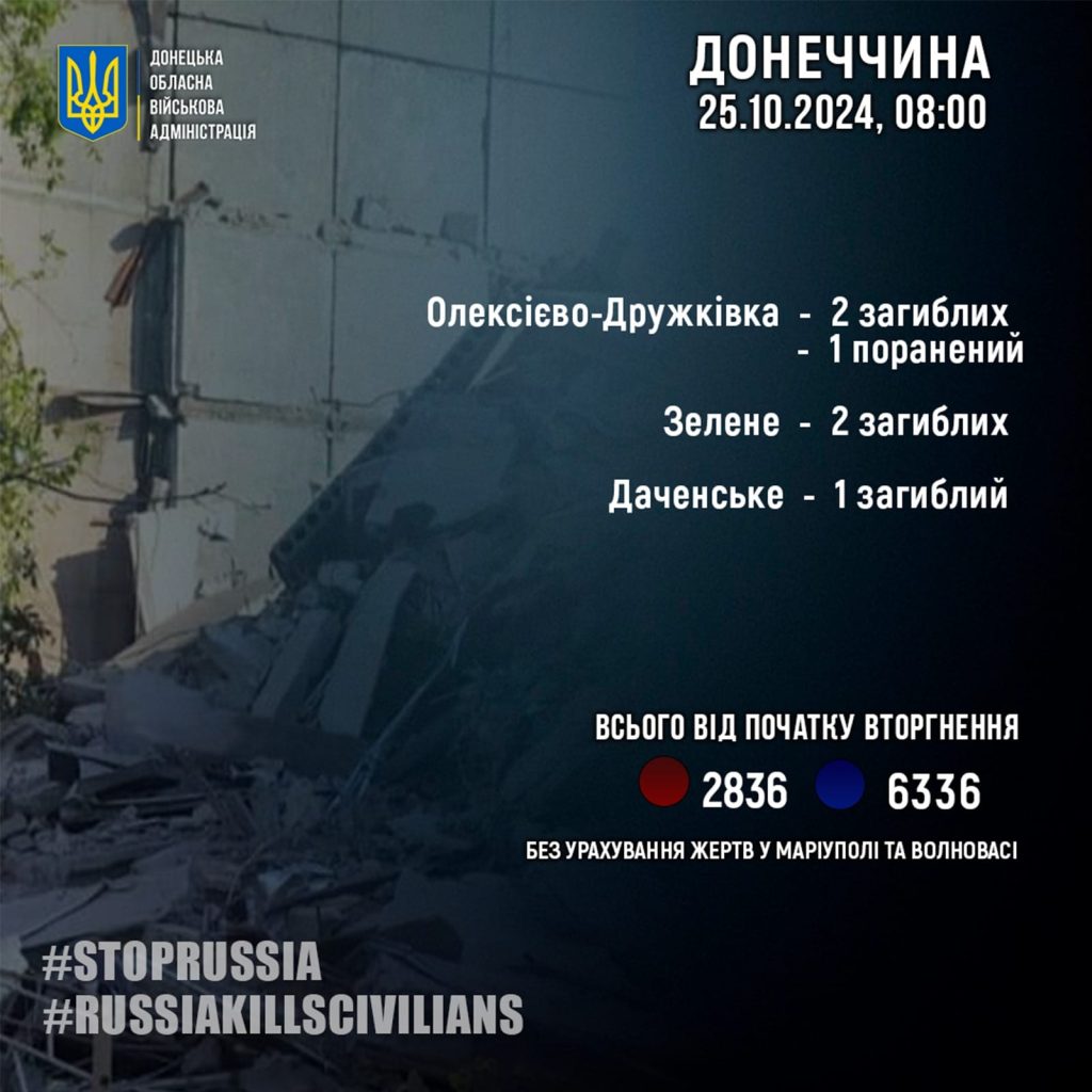 За 24 жовтня росіяни вбили 5 жителів Донеччини: 2 в Олексієво-Дружківці, 2 в Зеленому і 1 у Даченському. Про це повідомляє голова Донецької облдержадміністрації Вадим Філашкін.