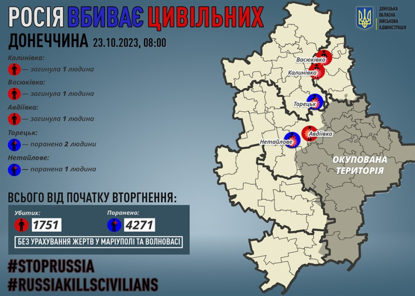 За 22 жовтня росіяни вбили 3 жителів Донеччини — в Авдіївці, Калинівці і Васюківці.