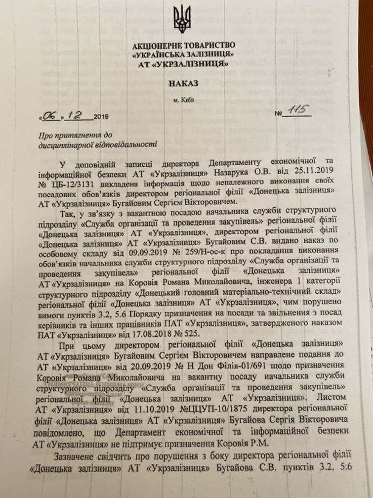 Причина увольнения Бугаева – нарушение трудовой дисциплины и систематическое неисполнение без уважительных причин должностных обязанностей. Об этом говорится в приказе, что разместил на своей странице сам эксдиректор «Донецкой железной дороги».