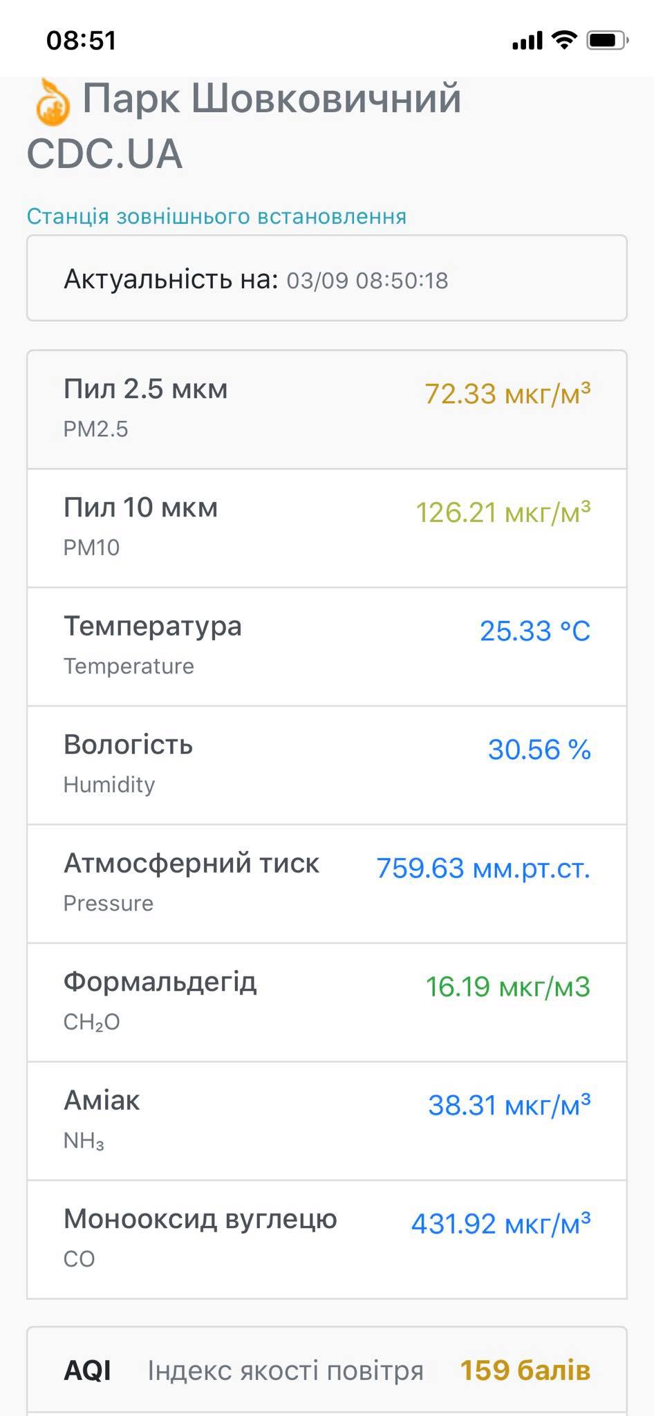 Зашкаливают показатели микрочастиц PM2.5 и PM10. Это указывает на наличие в воздухе мелкодисперсных частиц пыли или дыма.
