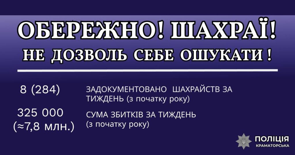 Минулого тижня 8 жителів Краматорського району стали жертвами шахраїв – поліція нагадує про обережність Втративши пильність заявники позбулися близько 325 тисяч гривень.