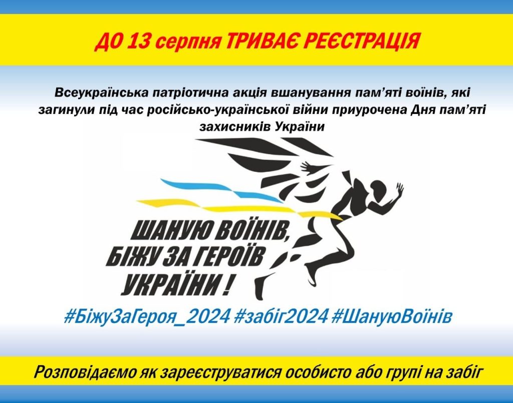 До 13 серпня включно триває реєстрація на 7-й патріотичний забіг «Шаную воїнів, біжу за героїв України»