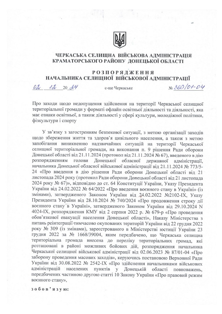 У документі зазначається, що на території Черкаської селищної громади «заборонено здійснення у форматі офлайн (безпосередня присутність учасників) освітньої діяльності та діяльності, яка має ознаки освітньої, а також діяльності у сфері культури, молодіжної політики, фізкультури і спорту, суб’єктами її здійснення будь-якої форми власності та за участю малолітніх та/або неповнолітніх осіб».