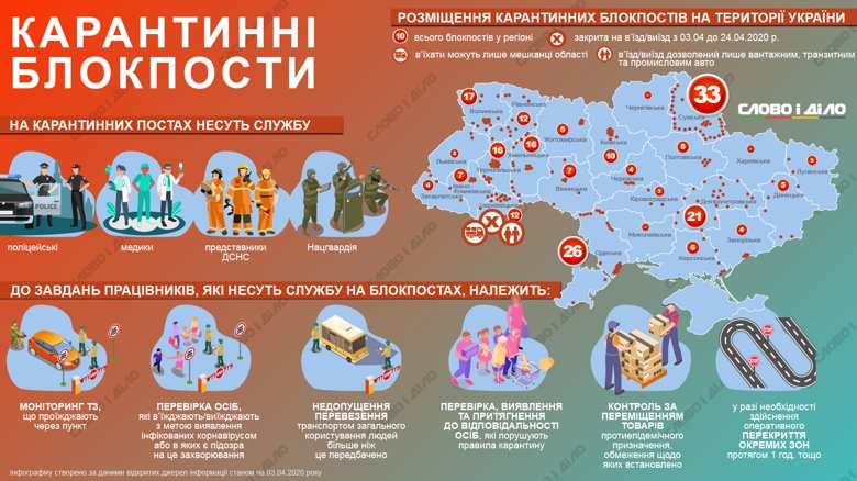 На КПП несут дежурство работники Национальной полиции Украины, Государственной службы Украины по чрезвычайным ситуациям, Госпродпотребслужбы, Национальной гвардии Украины, медицинские работники, которые снабжены всеми необходимыми санитарными средствами.